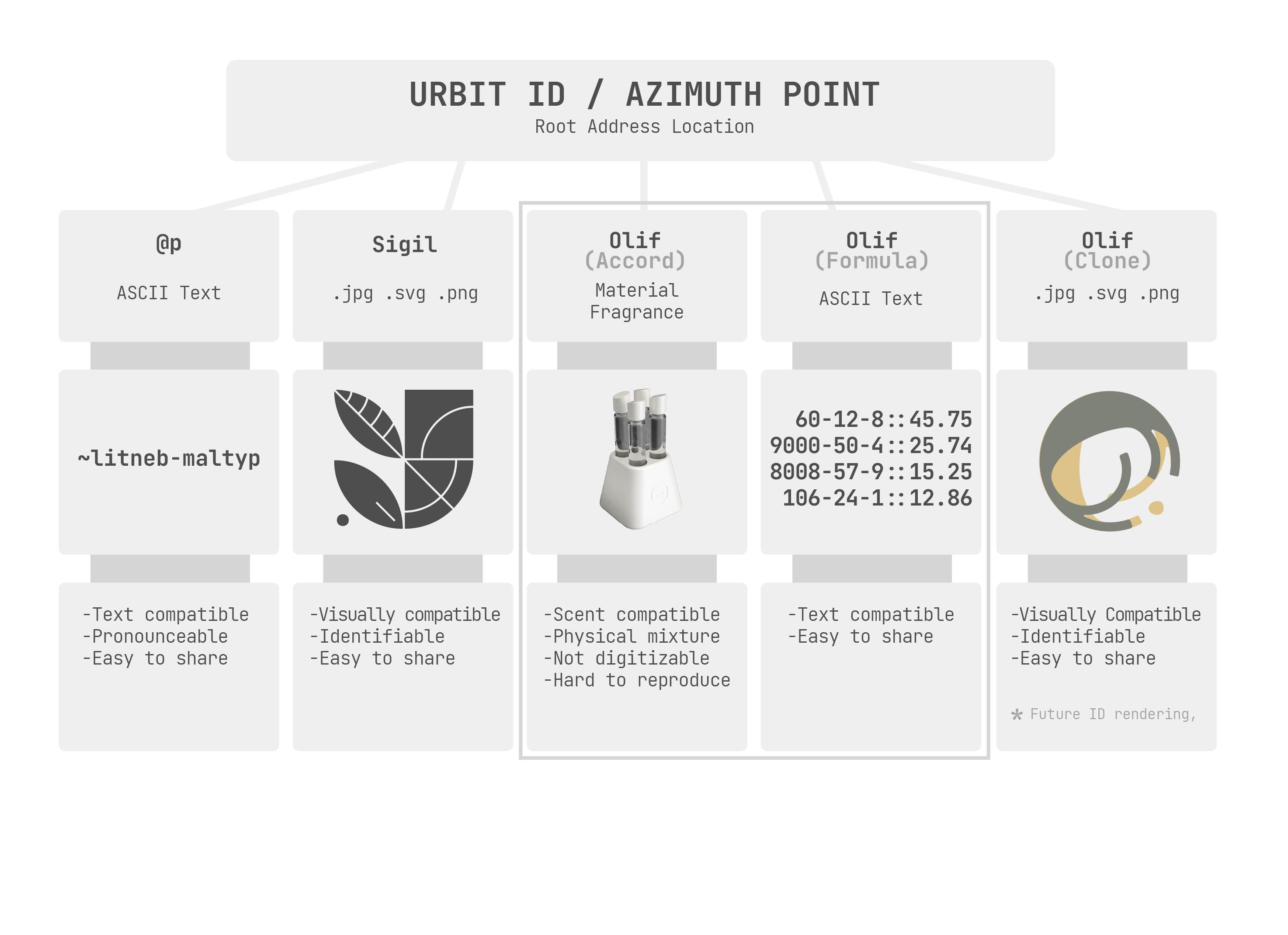 An Olif is an olfactive rendering of an Urbit address, an olfactory counterpart to the verbal @p and visual sigil, transforming any Urbit ID into a unique, smellable identity.